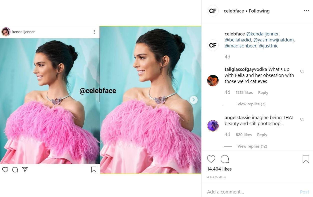 Selain menampilkan foto close-up, celebface juga menampilkan postur tubuh seorang supermodel Kendall Jenner. Pada salah satu fotonya, akun tersebut menguak bahwa foto Kendall telah melewati proses editing digital dengan memperkecil bagian leher dan tangan bagian atas ketika dirinya menggunakan gaun berbulu lebat berwarna merah muda.