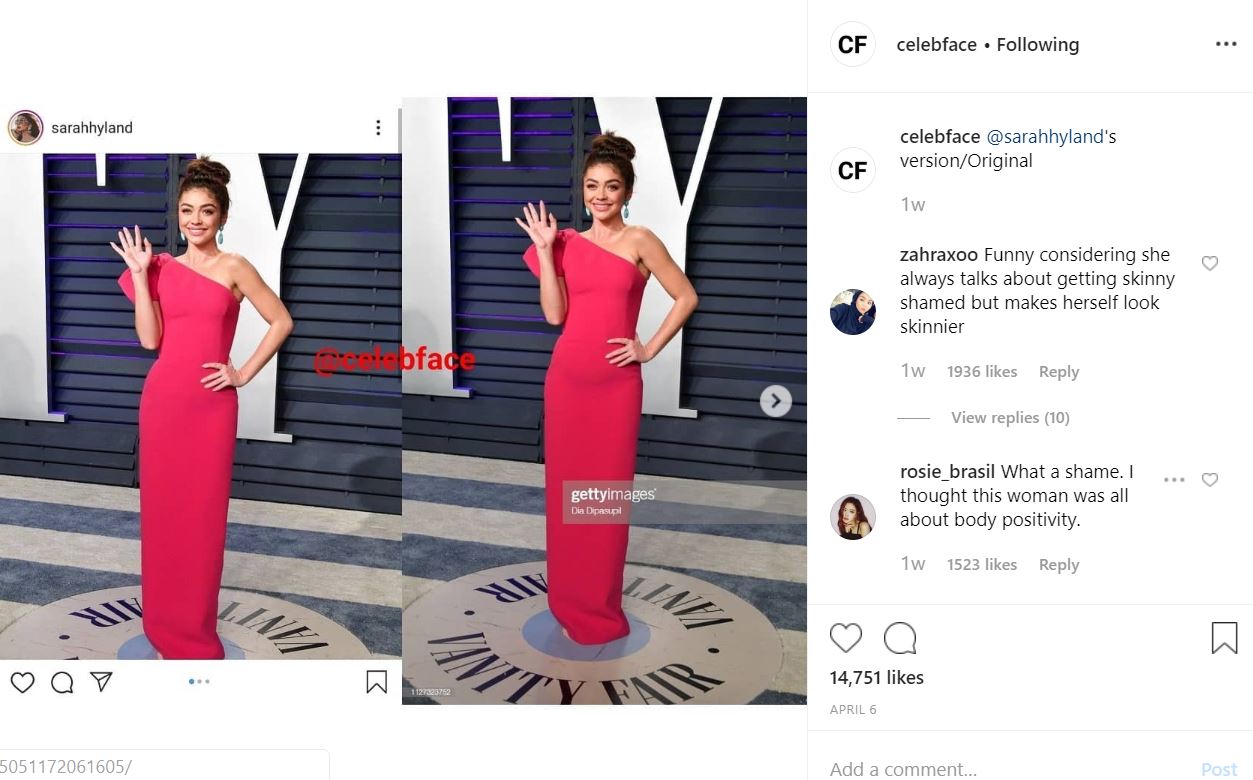 Kamu juga dapat melihat postur tubuh asli aktris pemeran film Vampire Academy, Sarah Hyland. Aktris cantik asal California tersebut telah menjalani olah gambar sehingga bahunya terlihat lebih kecil serta pinggul yang lebih terbentuk. Tidak lupa juga penambahan efek kecerahan agar wajar terlihat lebih segar.