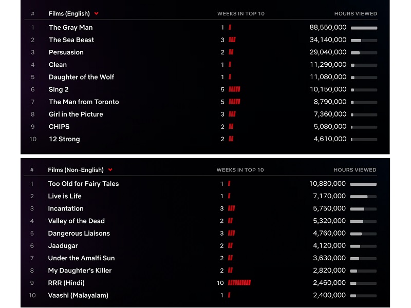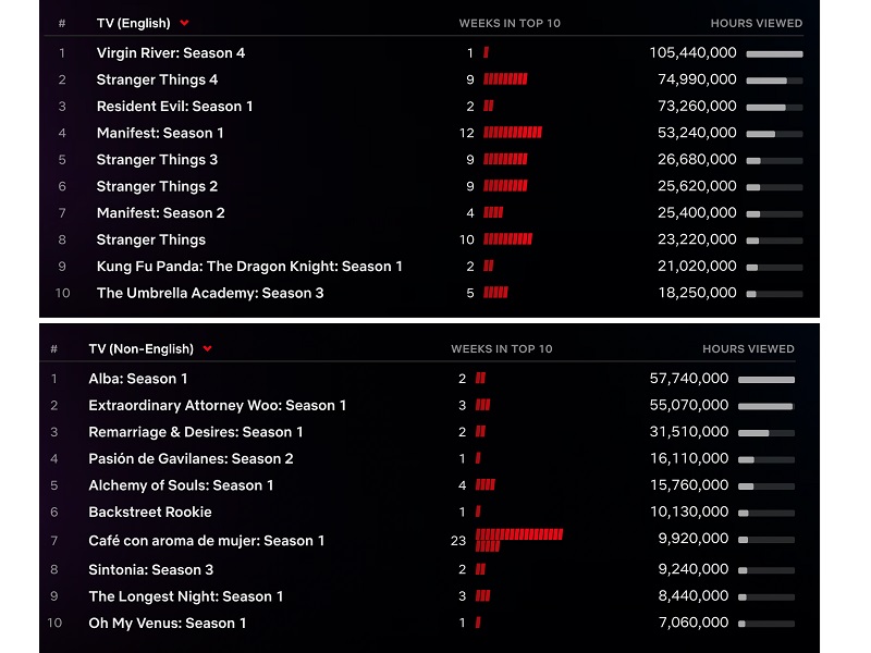 Sementara itu, untuk kategori serial, Virgin River 4 berada di puncak, menandai berakhirnya masa kejayaan Stranger Things 4. Sejak debut 27 Mei lalu, Stranger Things 4 Vol. 1 menduduki puncak tangga lagu Netflix hanya selama satu minggu, yang kemudian digantikan oleh The Umbrella Academy 3. Namun, waralaba Stranger Things kembali mengambil alih setelah Vol. 2 tayang 1 Juli.