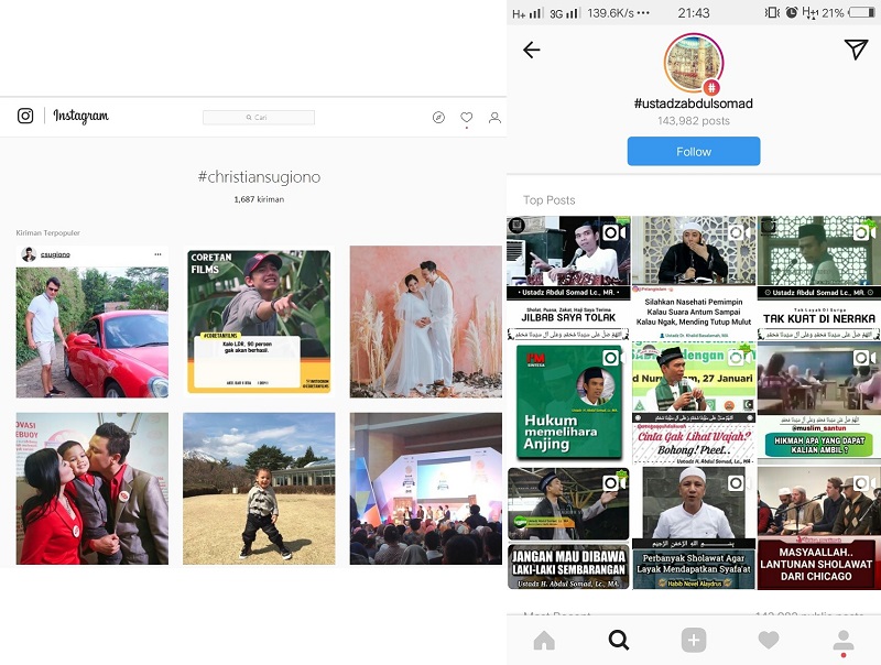 Saya pun membandingkan akun Utadz Absul Somad dengan akun Christian Sugiono. Tagar Ustadz Abdul Somad sepuluh kali lipat jumlahnya daripada tagar Christian Sugiono. Padahal jumlah pengikutnya tidak berbeda terlalu jauh. Christian Sugiono sendiri memiliki 1,1 juta pengikut di Instagram.