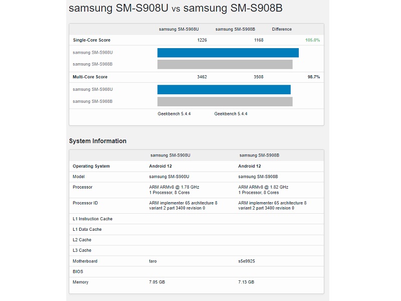 Galaxy S22 Ultra Exynos 2200 dengan kode nama SM-S908B diadu dengan Galaxy S22 Ultra Snapdragon 8 Gen 1 yang memiliki kode nama SM-S908U. Data yang digunakan dalam perbandingan adalah skor tertinggi dari kedua varian dan hasilnya cukup mengejutkan.