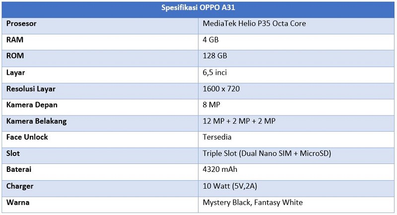 “OPPO A31 hadir ditujukan untuk menyasar pengguna pemula dengan kebutuhan perangkat yang memiliki penyimpanan besar, kamera mumpuni dan daya tahan baterai yang lebih baik. Kehadiran A31 di pasar juga ditujukan untuk merangsang konversi pengguna feature phone agar mereka dapar merasakan kecanggihan teknologi ponsel pintar dengan harga yang lebih terjangkau,” kata PR Manager OPPO Indonesia, Aryo Meidianto.