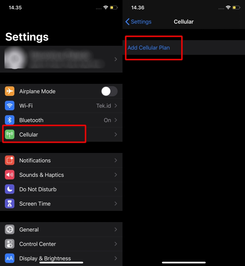 - Buka Settings >> Celular. Kemudian pilih add Cellular Plan.