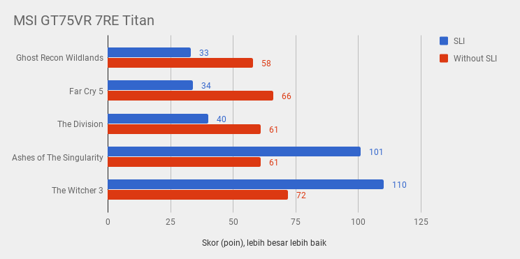 Namun sayangnya ada beberpa gim yang ternyata tidak bisa berjalan lancar ketika dijalankan menggunakan mode SLI. Mengingat harga laptop ini kurang labih setara dengan laptop tipis kelas atas, rasanya penggunaan GPU dengan konfigurasi SLI terlihat sedikit percuma. Tapi memiliki laptop ini tetap merupakan kebanggaan tersendiri.