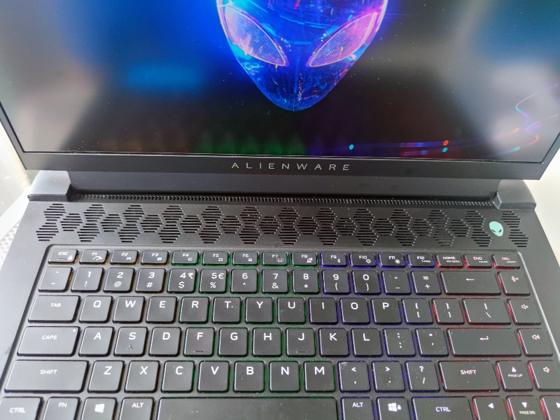 Keyboardnya sendiri memiliki tipe TKL, terdapat tiga zona pencahayaan RGB yang dapat dikonfigurasi oleh pengguna melalui aplikasi alienware command center. Dan yang paling menarik adalah hadirnya empat tombol shortcut tambahan, yakni mute/unmute microphone, mute/unmute volume, serta volume up down.