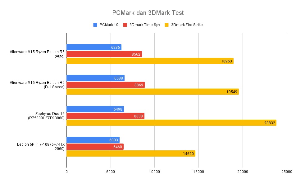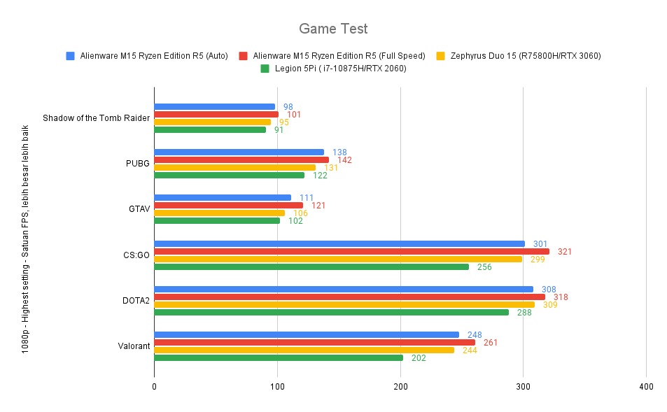 Sedangkan di berbagai pengujian gim AAA, Alienware M15 Ryzen Edition R5 memiliki rata-rata fps yang playable. Bahkan kami dapat mengaktifkan pengaturan tertinggi beserta penggunaan fitur ray tracing dan masih memiliki fps di atas 60 fps.