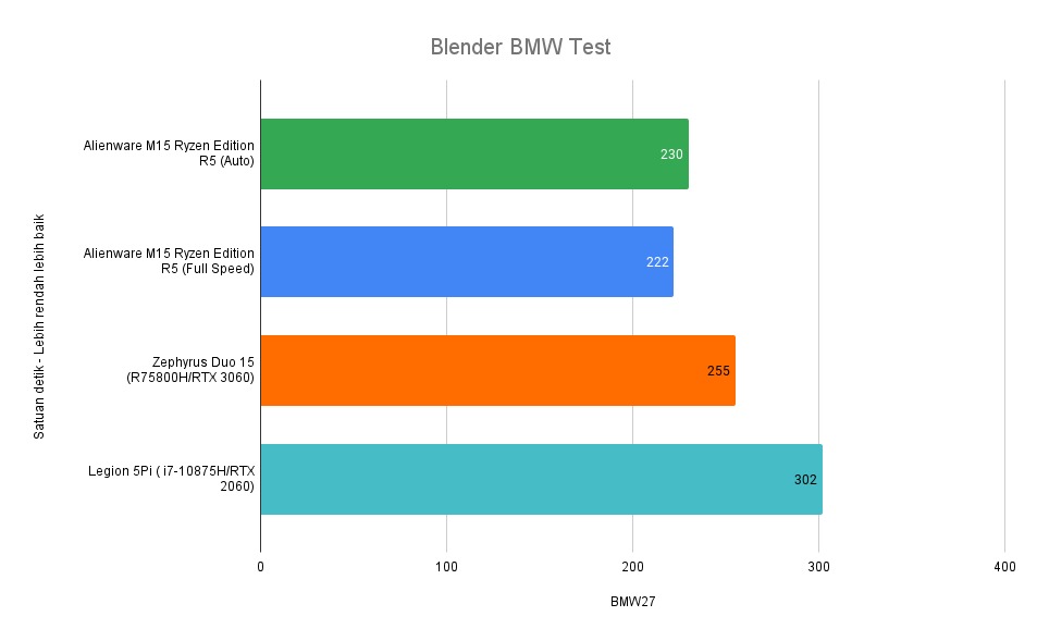 Saat kami uji menggunakan aplikasi Blender dengan file test BMW, terdapat perbedaan yang cukup terasa. saat menggunakan mode standar, laptop ini membutuhkan waktu 3 menit 50 detik. Sementara untuk mode full speed, membutuhkan waktu sekitar 3 menit 42 detik.