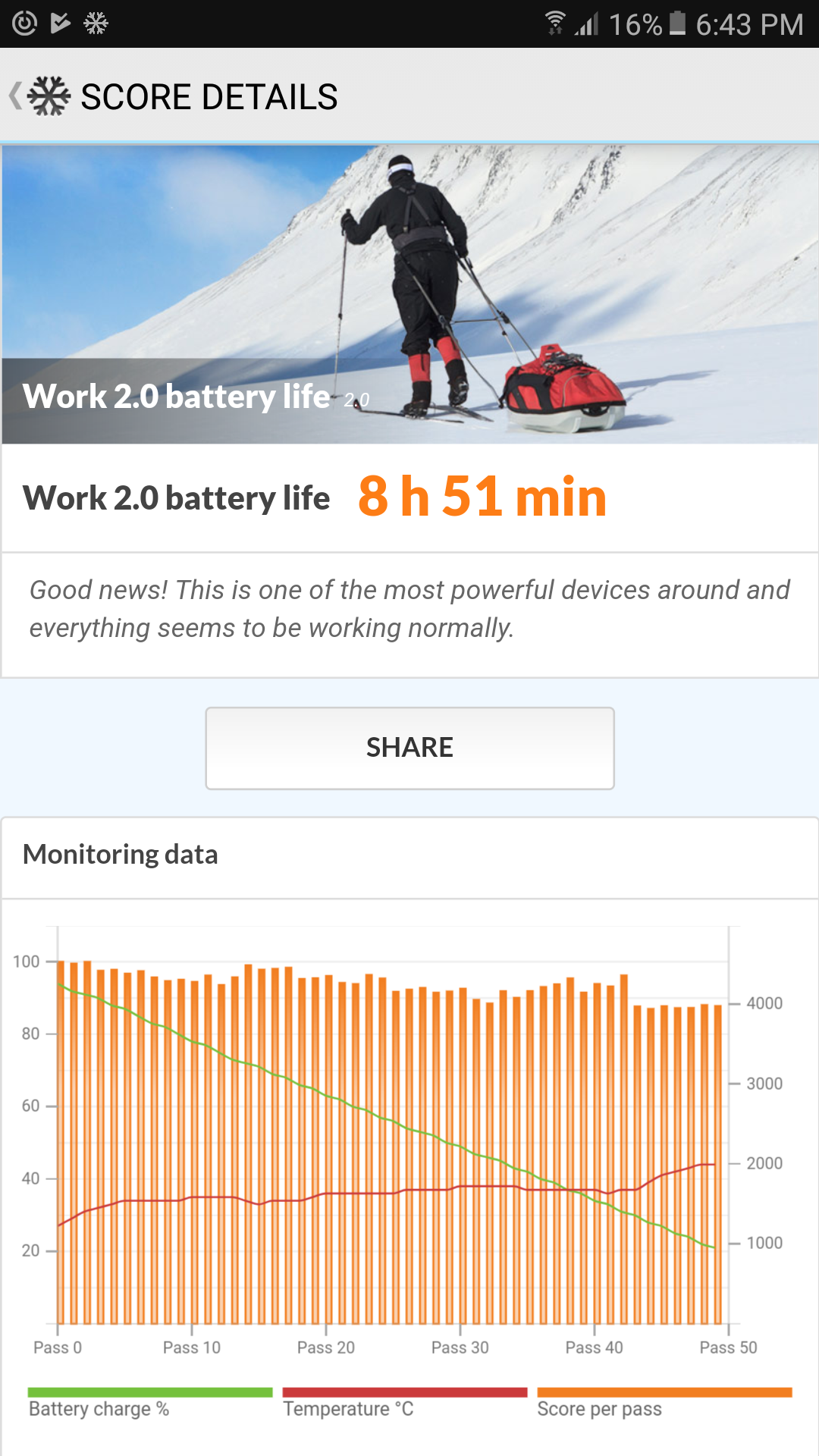 Baterai selalu menjadi salah satu bagian penting dalam ponsel. Diuji dengan aplikasi PC Mark for Android, Galaxy C9 Pro mampu bertahan 8 jam 51 menit. Ini angka yang memuaskan mengingat layarnya yang lebar. Menariknya, walau berkapasitas baterai besar, ponsel ini masih tetap gaya dalam desain yang tipis.