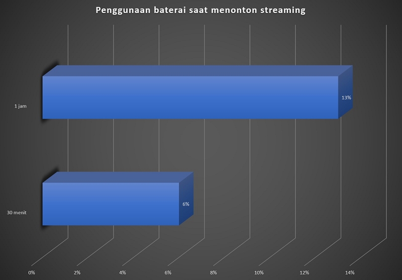 Selain bermain gim PUBG Mobile, baterai ponsel ini juga diuji untuk menonton film secara online. Selang 30 menit berjalan, persentase kapasitas baterai yang terpakai adalah 6%. Setelah 1 jam dipakai menonton film secara streaming, maka energi baterai yang terpakai adalah sebanyak 13%.