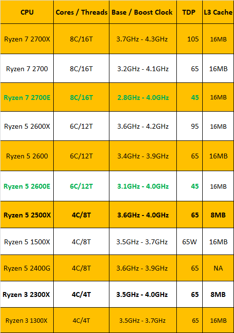 Keempat prosesor baru itu adalah Ryzen 7 2700E, Ryzen 5 2600E, Ryzen 5 2500X, dan Ryzen 3 2300X. Khusus dua seri ‘E’ dari jajaran prosesor terbaru itu memiliki Thermal Design Power (TDP) sebesar 45W, berbeda dengan seri lain yang menggunakan 65W.