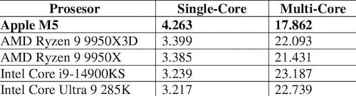 Dengan hasil ini, performa single-core M5 bahkan mampu menandingi prosesor desktop premium seperti Intel Core Ultra 9 285K yang mencatat skor tertinggi 4.306.