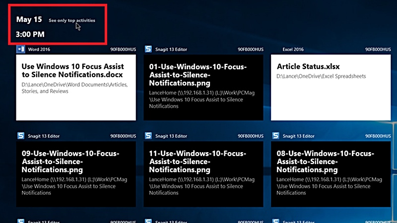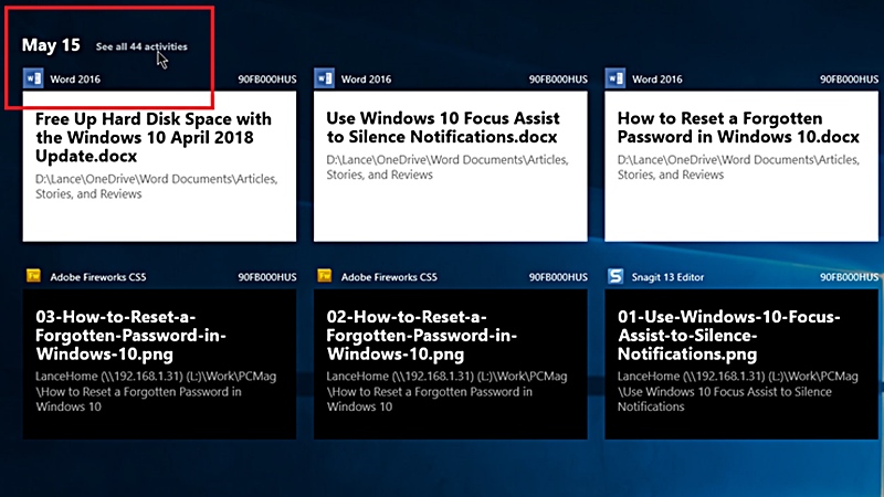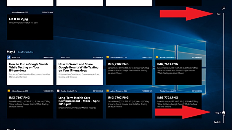 Menggunakan Task View, Anda dapat mengkreasi Virtual Desktop untuk menyimpan dan mengubah ke aplikasi dan jendela berbeda. Namun ini juga tempat di mana Anda mengakses Timeline, caranya gulir ke arah bawah hingga Anda melihat thumbnail file dari beberapa hari lalu. Klik thumbnail tersebut untuk file yang diinginkan.