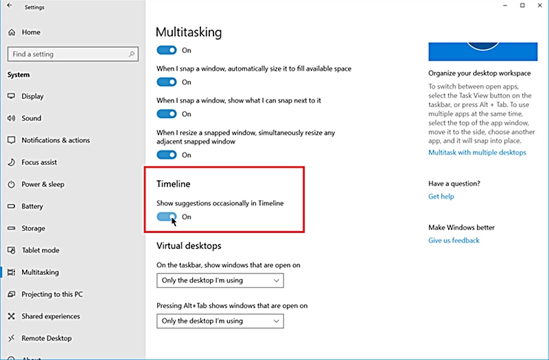 Anda dapat mengontrol dan melakukan kustomasi pengaturan tertentu untuk Timeline. Buka Settings > System > Multitasking. Windows dapat menampilkan aktivitas yang disarankan jika Anda ingin lihat di Timeline. Untuk melihat notifikasi tersebut, aktifkan “Show suggestion occasionally in Timeline.”
