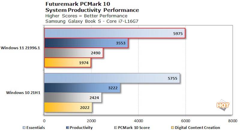 Di samping itu, Hot Hardware juga melakukan pengujian baterai. Kali ini pengujian dilakukan pada Samsung Galaxy Book S yang tidak menjanjikan kinerja baik pada Windows 10. Hasilnya, keunggulan performa Windows 11 yang didapat tidak terlalu besar, tetapi masih cukup signifikan untuk diperhatikan.