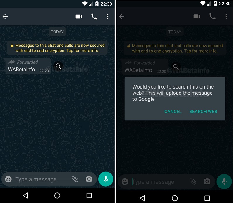Ketika pengguna mengetuk ikon pencarian itu, sebuah kotak dialog akan muncul. Kotak dialog itu akan menanyakan kepada pengguna apakah ingin mencari berita tersebut di internet. Untuk itu, WhatsApp secara otomatis akan mengunggah pesan itu ke Google. Ketika pengguna mengetuk “Search Web”, WhatsApp akan memasukkan seluruh pesan tersebut ke Google Search untuk memverifikasinya.