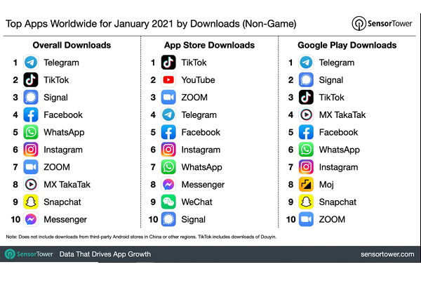Signal, Facebook, WhatsApp, Instagram, ZOOM, MS TakaTak, Snapchat, dan Messenger mengikuti Telegram dan TikTok sebagai 10 besar aplikasi non-game yang paling banyak diunduh pada Januari 2021.