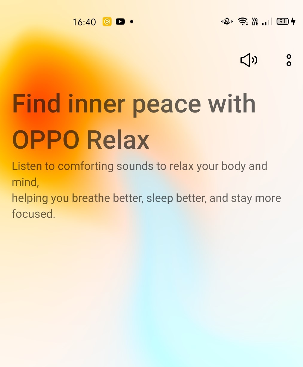 OPPO Relax merupakan fitur yang terdapat pada ColorOS 7. Fitur ini terinspirasi dari beberapa penelitian di mana suara musik dapat membuat Anda lebih berkonsentrasi, santai, bahkan bisa membantu Anda tertidur. Fitur ini memiliki berbagai macam suara dari alam yang akan memberikan efek relaksasi ketika diaktifkan.
